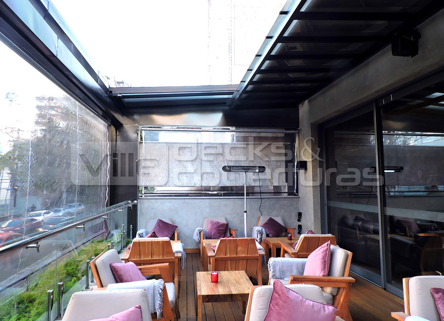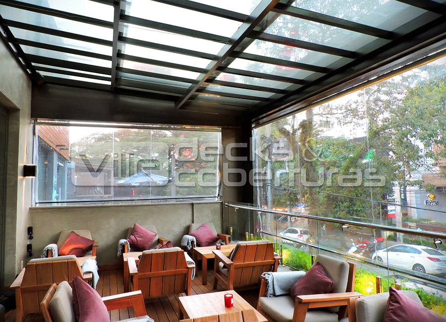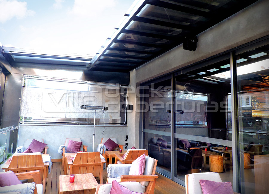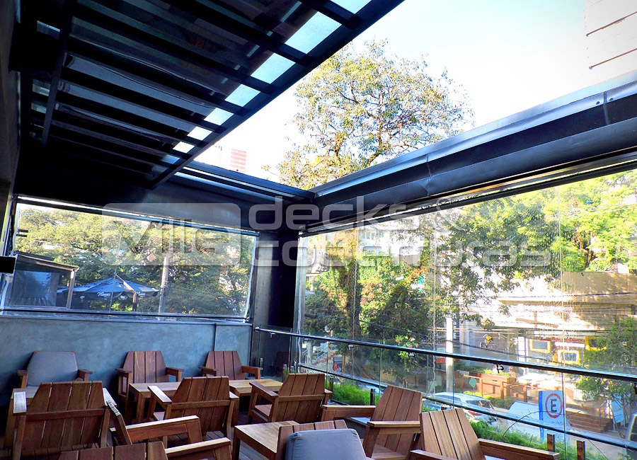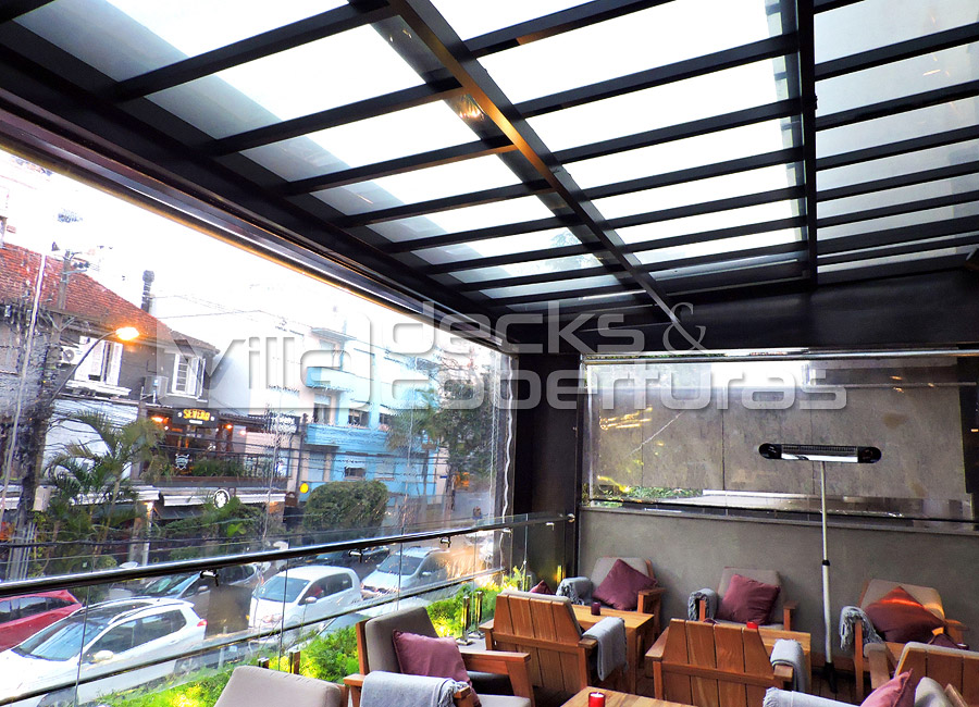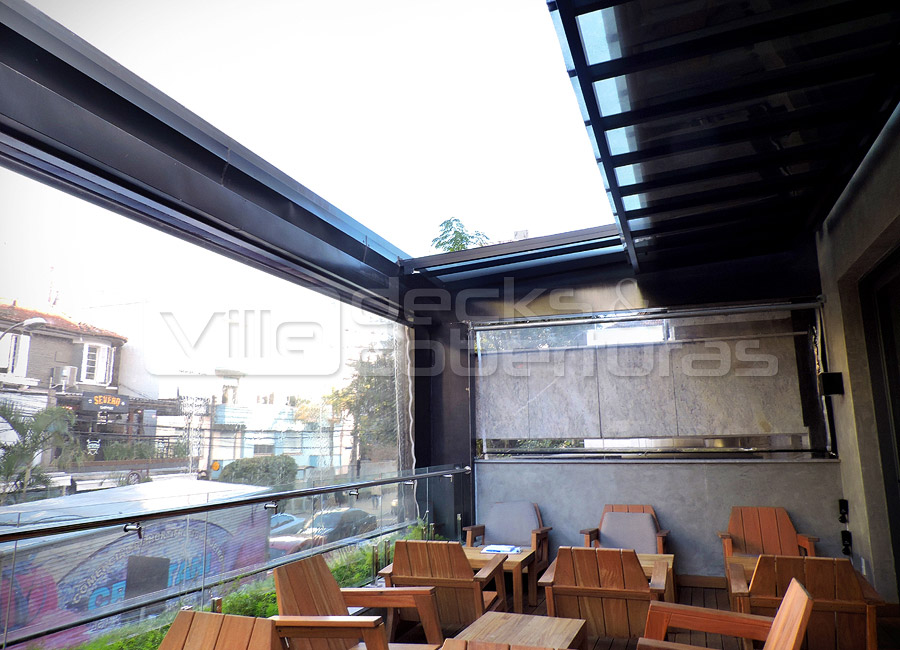 Seu pub deve prezar por conforto, ambiente protegido e, preferencialmente, boa estética visual. Para atender a esta sua necessidade e criar outra vantagens, a Ville DC projetou a Cobertura Retrátil Para Pubs! A Cobertura Retrátil Para Pub é projetada de maneira totalmente personalizada, visando se adaptar ao espaço onde será instaladoa, levando em conta a estrutura do local e todas as questões visuais relacionadas à sua demanda estética, como cor da estrutura e tonalidade de cor do policarbonato. Paralelo a isto, você adiciona ao seu ambiente uma estrutura funcional, que agregará à manutenção de temperatura local com aproveitamento de iluminação natural e possibilidade de circulação de ar externo. Com um simples clique no controle remoto, você vai poder escolher abrir ou fechar sua cobertura, liberando o espaço para circulação de ar natural externo ou mantendo-o fechado para proteger da chuva (ou do calor do sol forte). O acionamento é prático e a movimentação é rápida e silenciosa; em poucos segundos, os módulos móveis da cobertura terminam seu trajeto, expandido-se por completo sobre o ambiente ou recolhendo-se para não ocupar espaço.