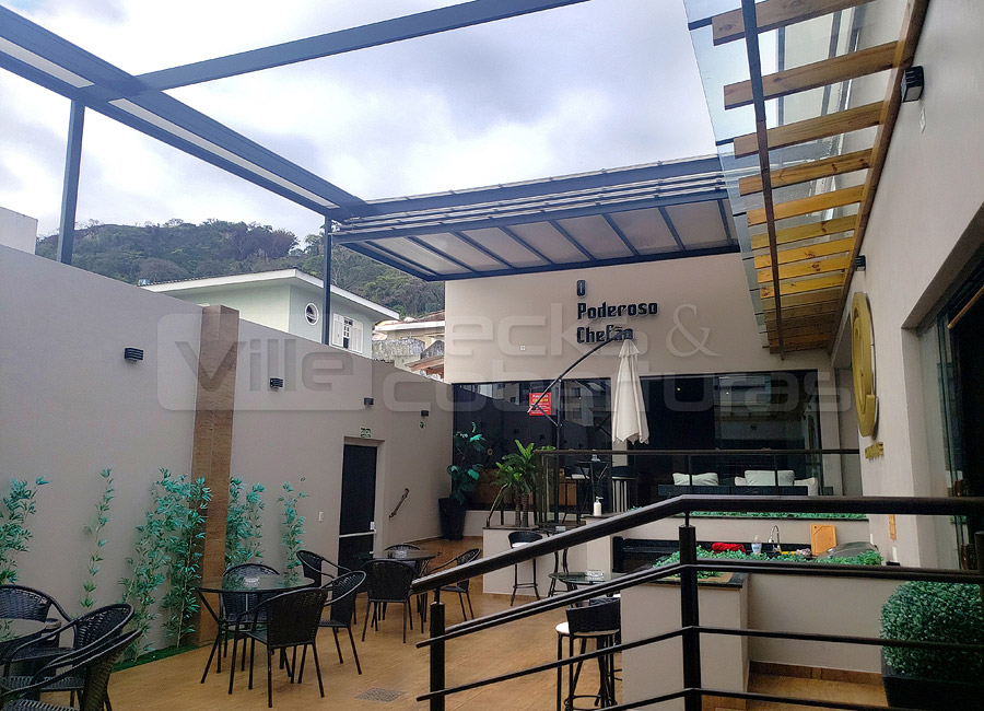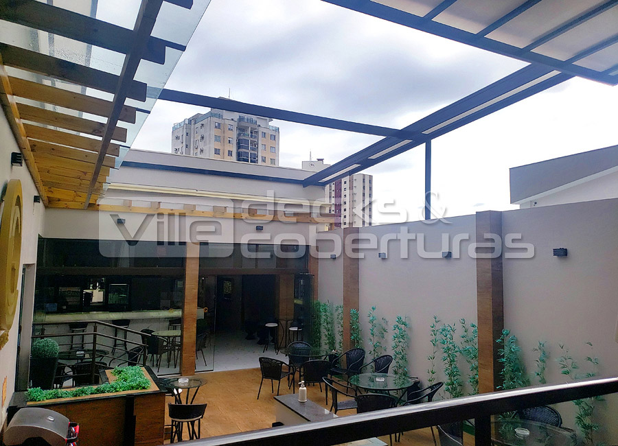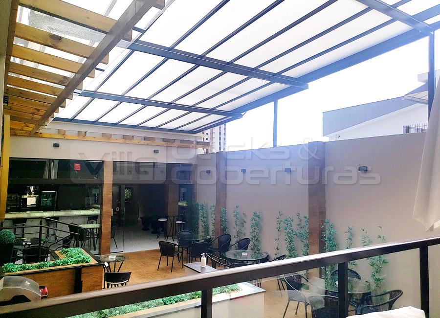 Quer oferecer um espaço de conforto e bem estar para seus clientes? Conheça a tecnologia da Cobertura Retrátil Para Restaurantes Ville DC. A cobertura consiste em um teto móvel de policarbonato, que abre e fecha conforme sua necessidade, e torna seu ambiente mais versátil e elegante. A movimentação do teto móvel é realmente prática: com acionamento por controle remoto, basta um clique no botão e, em poucos segundos, você movimenta os módulos móveis da cobertura por completo. Em dias de sol e tempo bom, você aproveita a passagem de luz natural e a circulação de ar externo. E em dias de calor excessivo ou chuva, basta fechar seu teto móvel, garantindo mais proteção conforto para todos em seu ambiente. O policarbonato utilizado na cobertura é o POLYSHADE. Este material possui tecnologia refletiva, que bloqueia totalmente os raios UV e diminui até 40% de calor proveniente de incidência direta do sol. A estrutura é elaborada em alumínio industrial, combinada com a pintura EPOXI (semelhante à pintura automotiva), garantindo altíssima resistência contra umidade e intempéries, mantendo a estrutura imune a oxidação e ferrugem. O mais incrível é que você não precisa se preocupar com sujeira e demora na instalação: a montagem completa é feita sem utilização de alvenaria e não demanda, desta forma, tempo de "cura". A fixação se dá por peças de encaixe, aplcadas nas estruturas de seu espaço. A instalação completa é realmente rápida, podendo levar de 1 dia a uma semana.