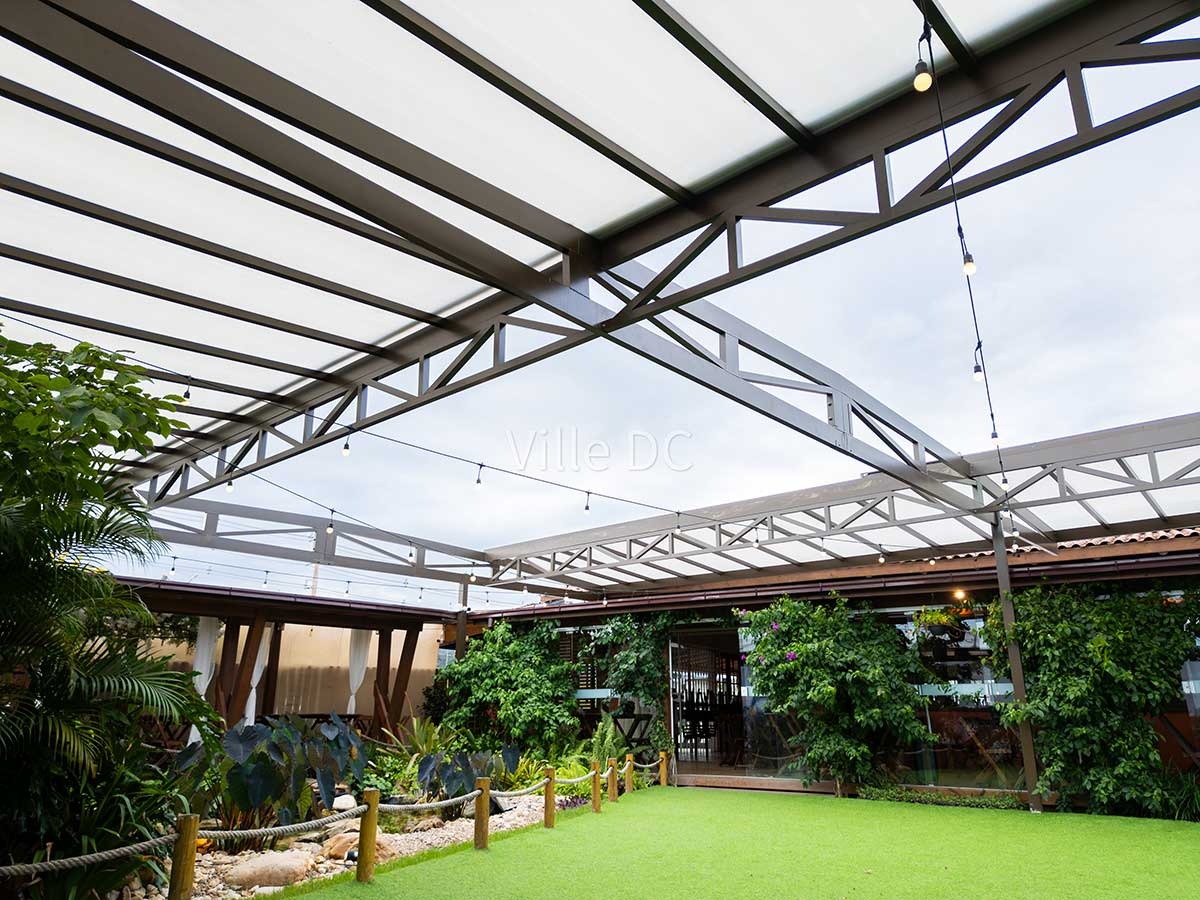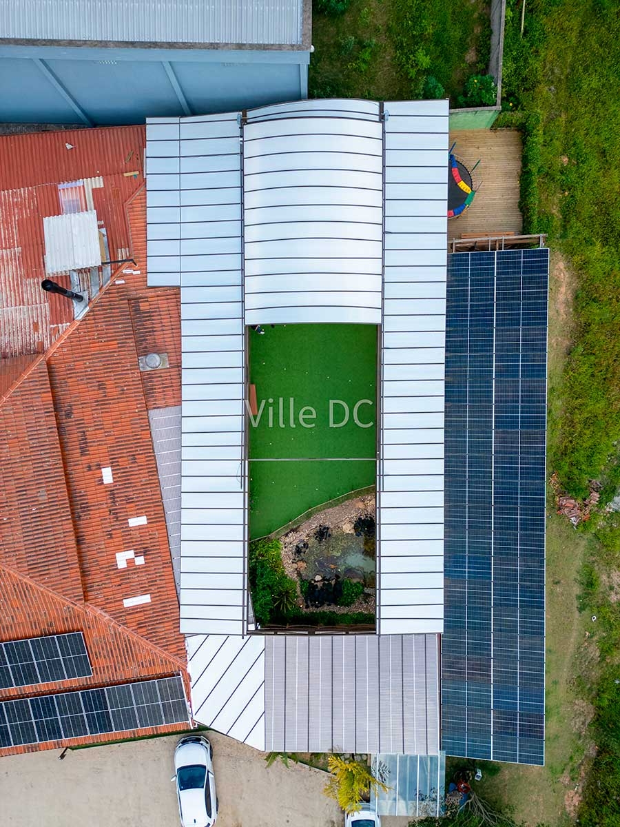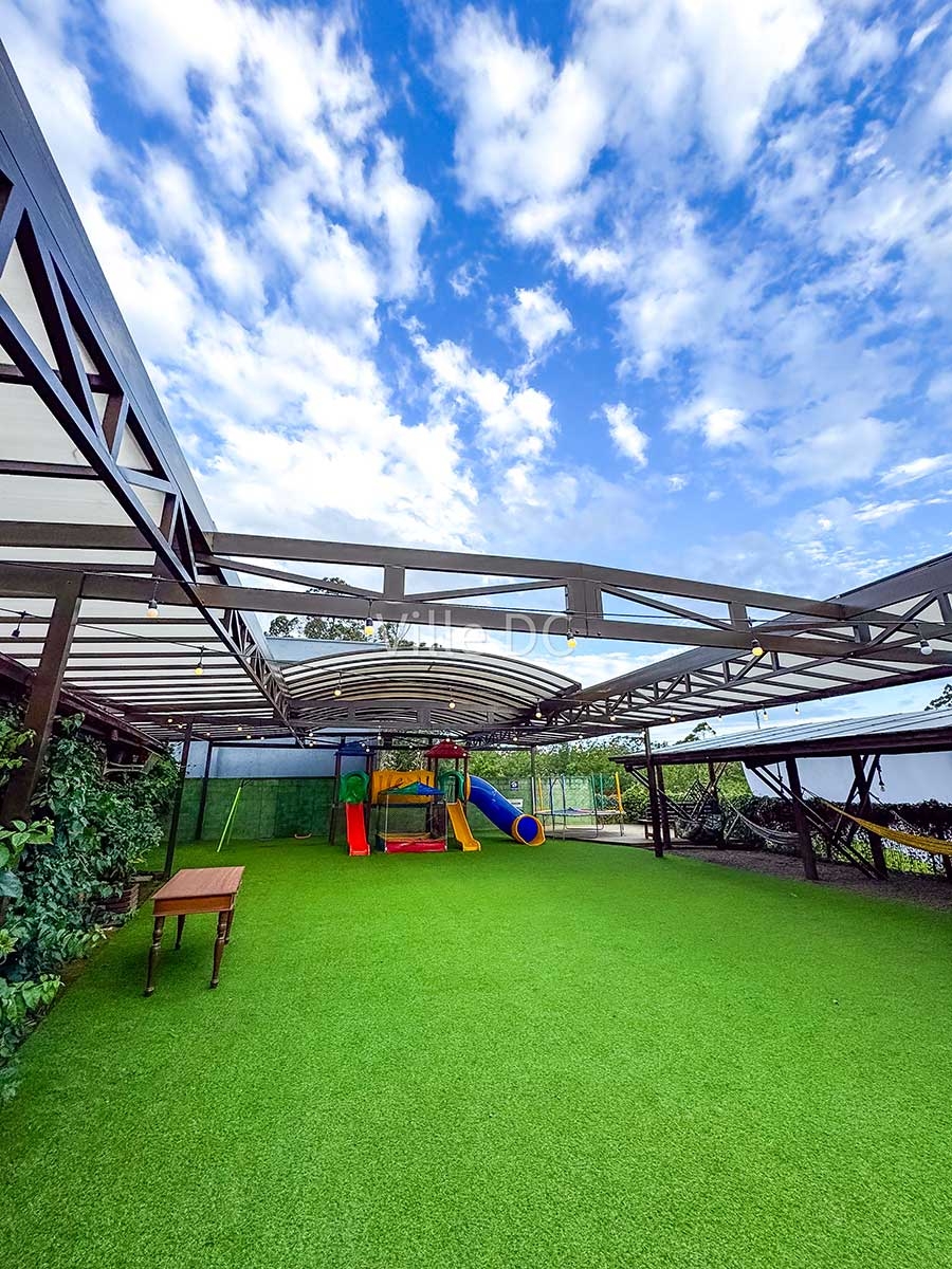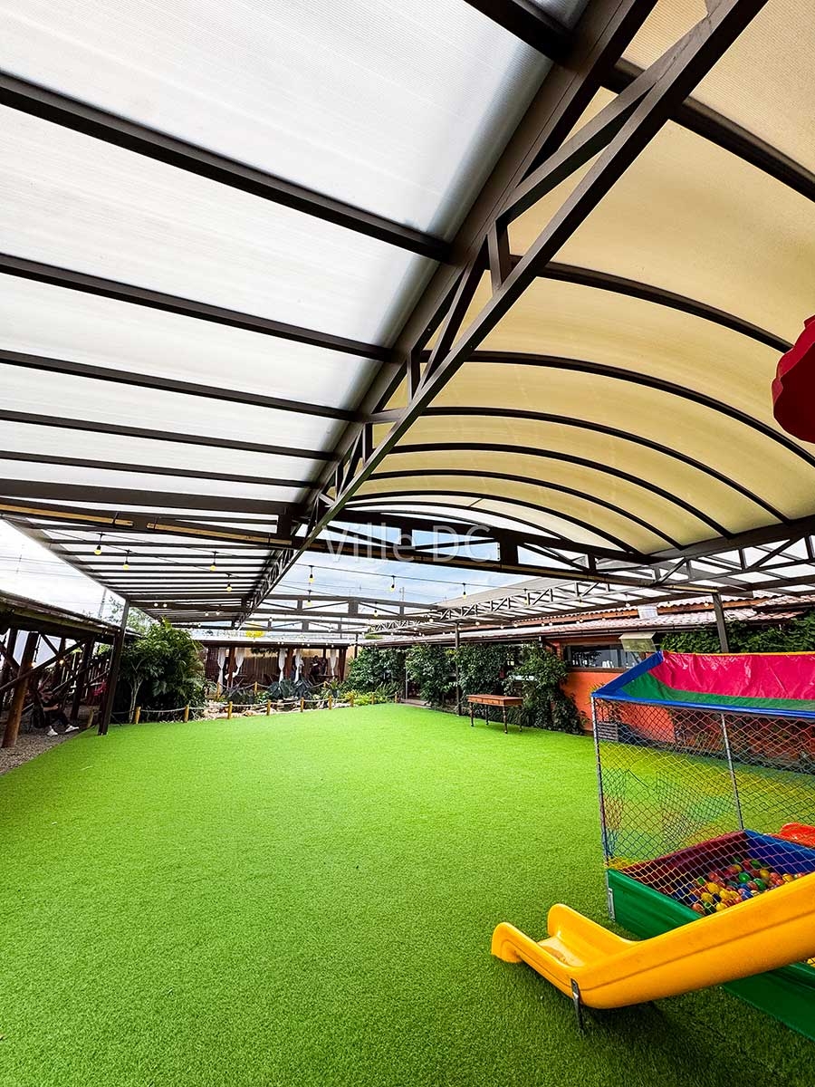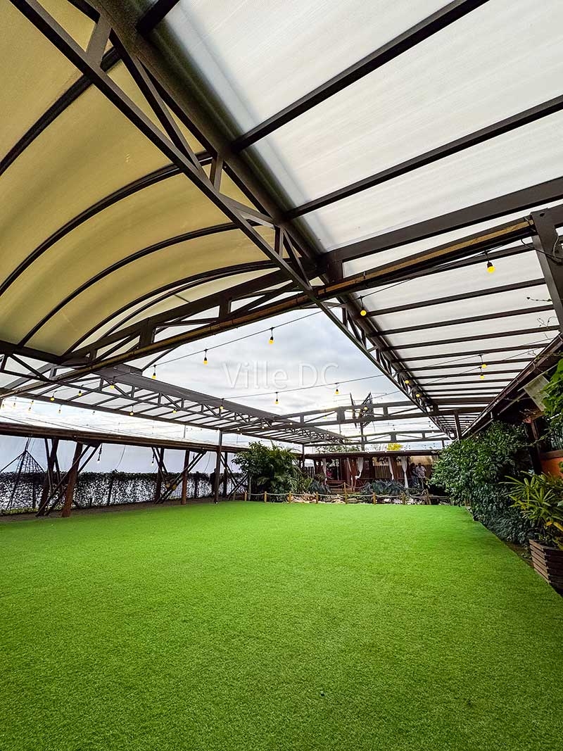 A Ville DC desenvolveu uma cobertura retrátil sob medida, pensada especificamente para a dinâmica de um espaço de eventos. O sistema permite abertura total ou parcial, adaptando o ambiente conforme o clima e o tipo de evento, além de manter a integração visual com a paisagem característica da região.