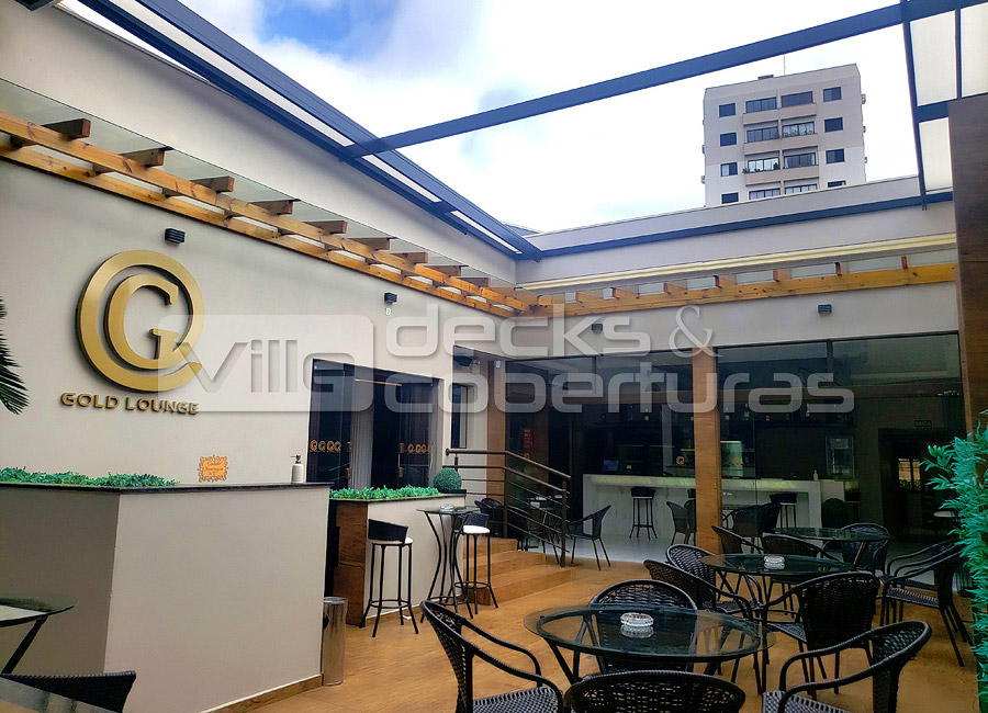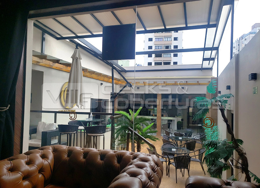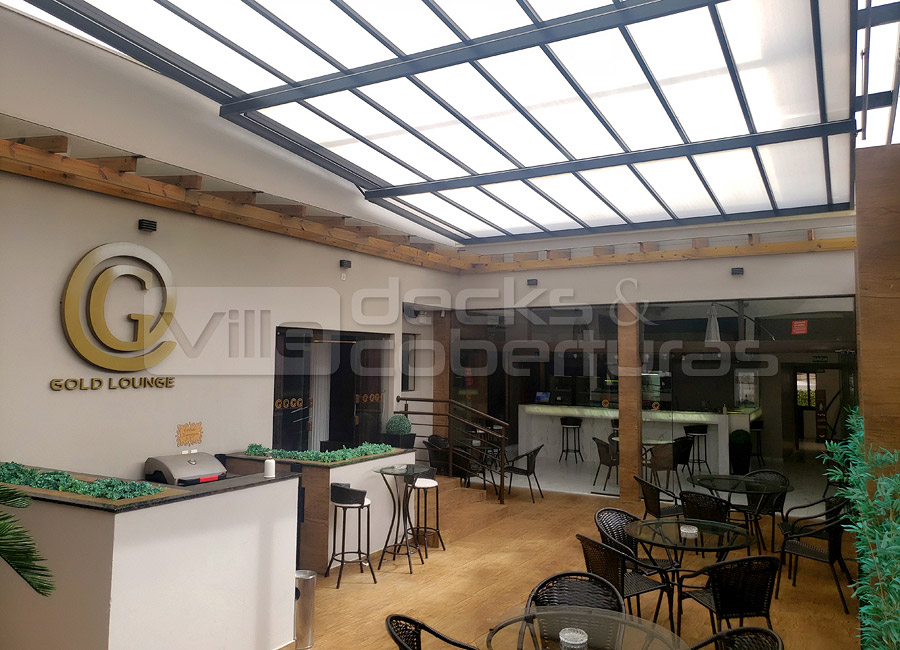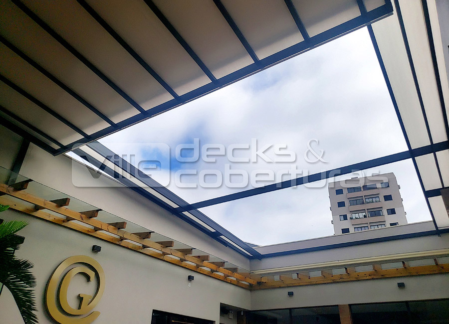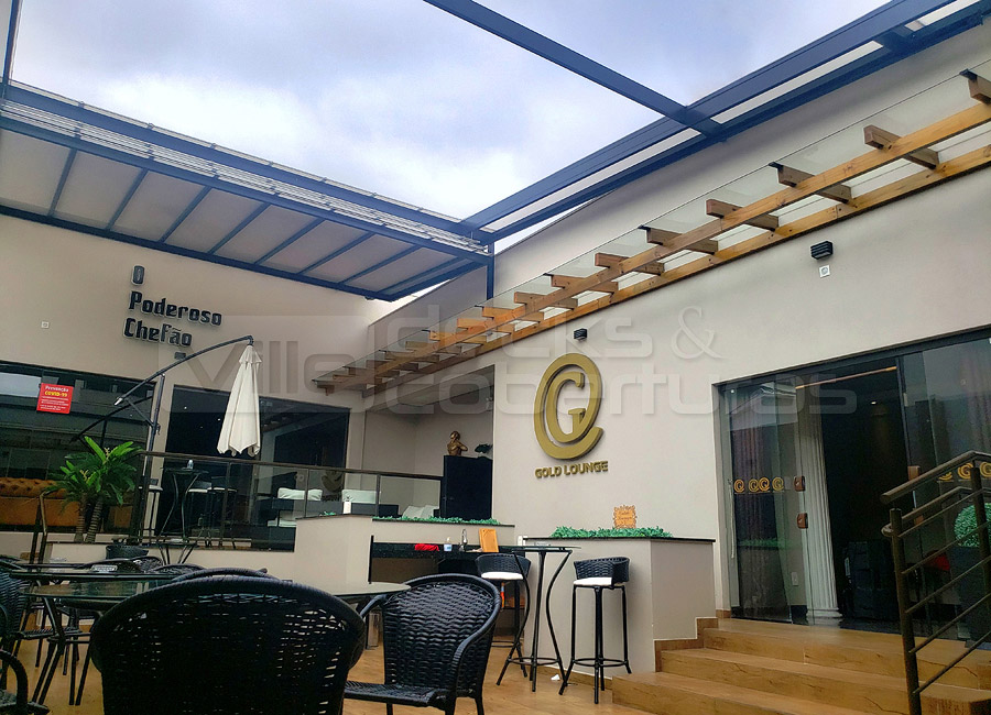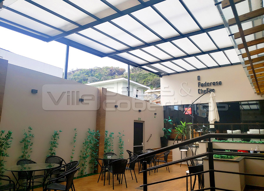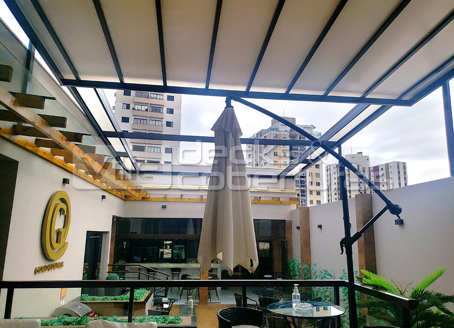 Quer oferecer um espaço de conforto e bem estar para seus clientes? Conheça a tecnologia da Cobertura Retrátil Para Restaurantes Ville DC. A cobertura consiste em um teto móvel de policarbonato, que abre e fecha conforme sua necessidade, e torna seu ambiente mais versátil e elegante. A movimentação do teto móvel é realmente prática: com acionamento por controle remoto, basta um clique no botão e, em poucos segundos, você movimenta os módulos móveis da cobertura por completo. Em dias de sol e tempo bom, você aproveita a passagem de luz natural e a circulação de ar externo. E em dias de calor excessivo ou chuva, basta fechar seu teto móvel, garantindo mais proteção conforto para todos em seu ambiente. O policarbonato utilizado na cobertura é o POLYSHADE. Este material possui tecnologia refletiva, que bloqueia totalmente os raios UV e diminui até 40% de calor proveniente de incidência direta do sol. A estrutura é elaborada em alumínio industrial, combinada com a pintura EPOXI (semelhante à pintura automotiva), garantindo altíssima resistência contra umidade e intempéries, mantendo a estrutura imune a oxidação e ferrugem. O mais incrível é que você não precisa se preocupar com sujeira e demora na instalação: a montagem completa é feita sem utilização de alvenaria e não demanda, desta forma, tempo de "cura". A fixação se dá por peças de encaixe, aplcadas nas estruturas de seu espaço. A instalação completa é realmente rápida, podendo levar de 1 dia a uma semana.
