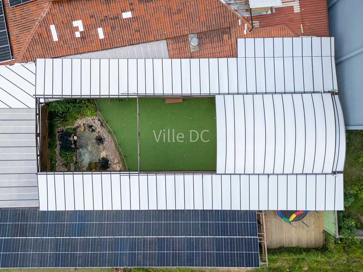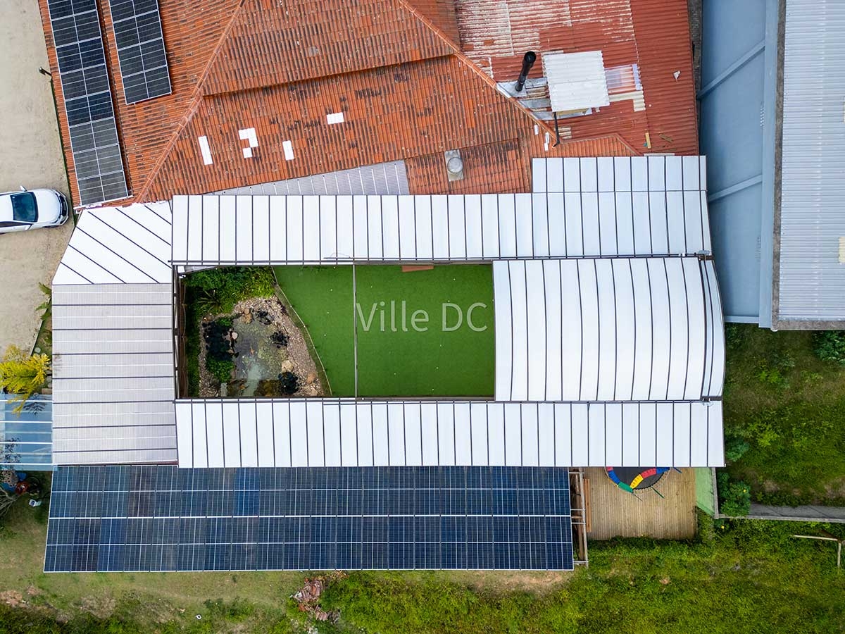 A Ville DC desenvolveu uma cobertura retrátil sob medida, pensada especificamente para a dinâmica de um espaço de eventos. O sistema permite abertura total ou parcial, adaptando o ambiente conforme o clima e o tipo de evento, além de manter a integração visual com a paisagem característica da região.