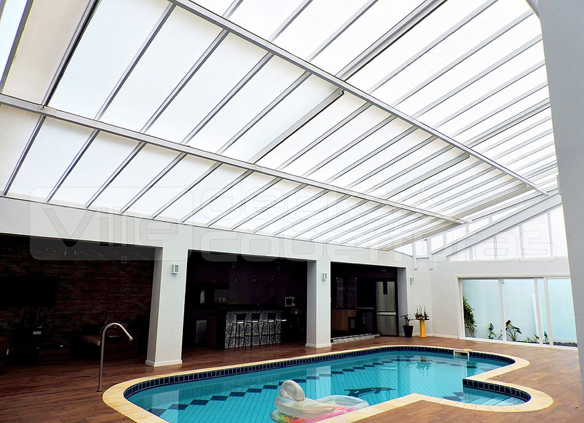 O telhado retrátil propicia o isolamento térmico de ambientes com piscina aquecida. Ao fechar seu espaço, você impede a entrada de frio externo, favorecendo economia de energia para manter a piscina quente. No verão, o policarbonato diminui até 40% da incidência de calor, tornando o espaço agradável. A chapa de policarbonato conta ainda com película bloqueadora dos raios UVA e UVB.